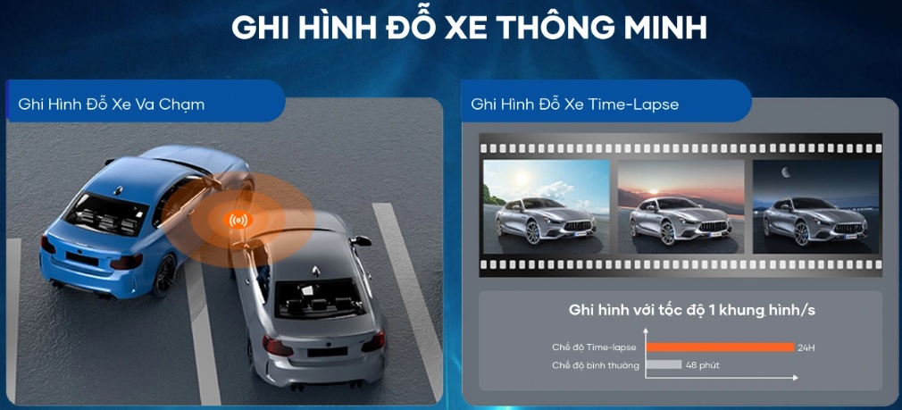 - Ghi hình đỗ xe Time-lapse: Chế độ ghi hình tua nhanh giúp tiết kiệm dung lượng bộ nhớ.
