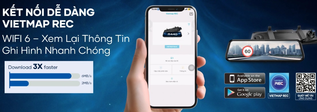 Vietmap R440 được trang bị Wi-Fi 6 cho tốc độ truyền và tải dữ liệu nhanh hơn gấp 3 lần chuẩn 2.4GHz thông thường, giúp kết nối ổn định và mượt mà. Khi kết hợp với ứng dụng Vietmap Rec, người dùng dễ dàng xem lại, trích xuất và chia sẻ video trực tiếp chỉ trong vài thao tác, nhanh chóng và tiện lợi.