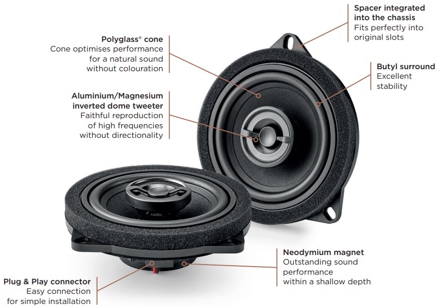 Focal IC BMW 100 v2 – bộ loa Plug & Play dành riêng cho xe BMW Series 3, 4 và i4, mang âm thanh HiFi chuẩn phòng thu ngay trên xe. Với màng Polyglass tái tạo trung âm tự nhiên, tweeter nhôm-magie chi tiết và công suất 40 W RMS, loa hoạt động mạnh mẽ với ampli zin mà không cần chỉnh sửa, giúp bạn nghe nhạc sống động hơn ngay lần lắp đầu tiên.