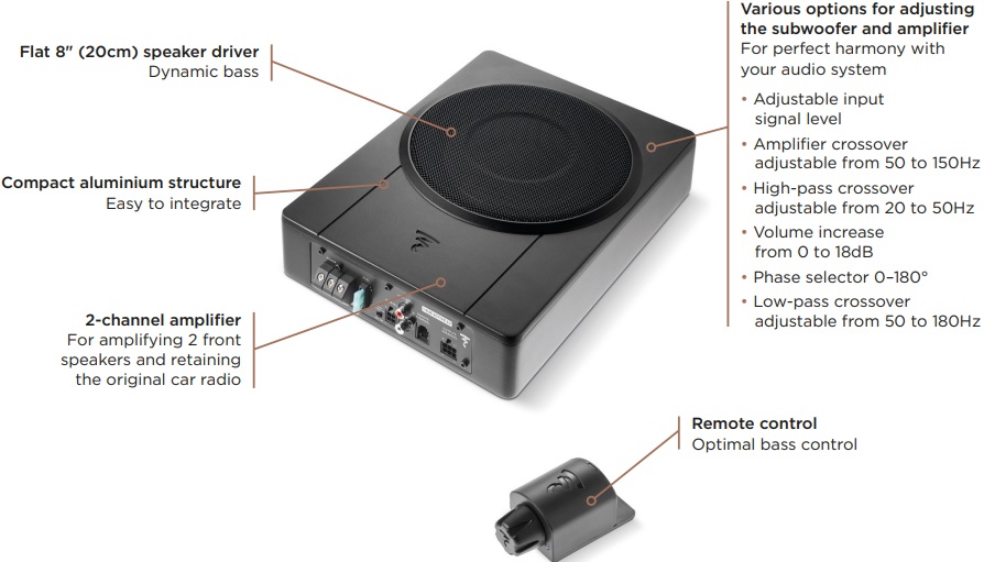 Focal Isub Actvie 2.1 là loa sub điện lắp dưới gầm ghế xe ô tô được tích hợp thêm ampli trong dòng Focal Inside - các sản phẩm về âm thanh chuyên biệt lắp cho xe hơi.